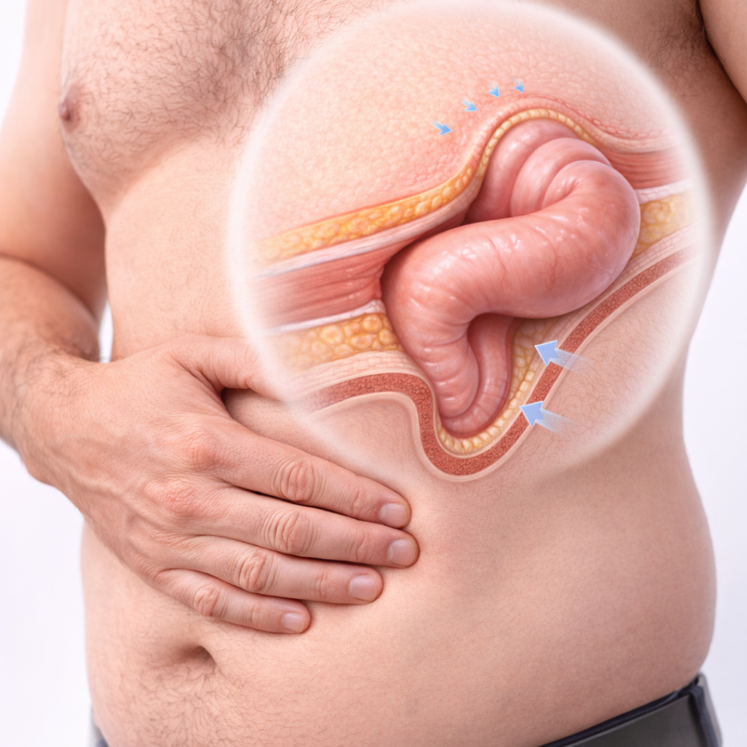 Hérnias acontecem quando uma parte interna do corpo “sai” por um ponto enfraquecido da parede abdominal. Elas não desaparecem sozinhas e, quando não tratadas, podem aumentar e até gerar complicações graves.