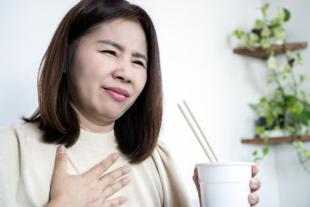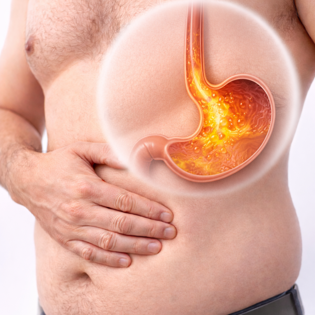 É o retorno do conteúdo ácido do estômago para o esôfago, causando irritação, inflamação e desconforto.